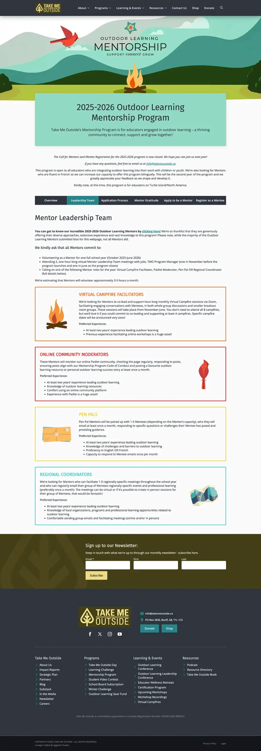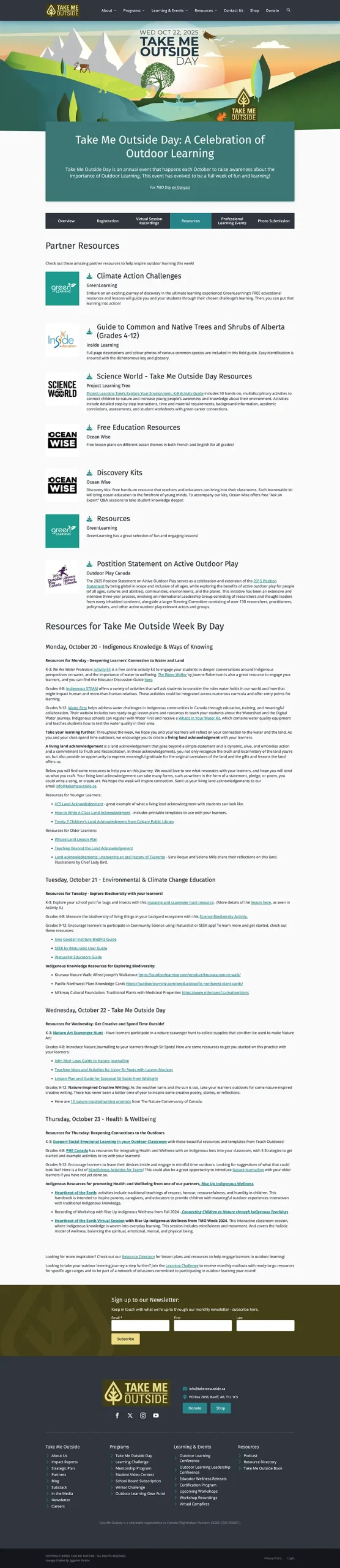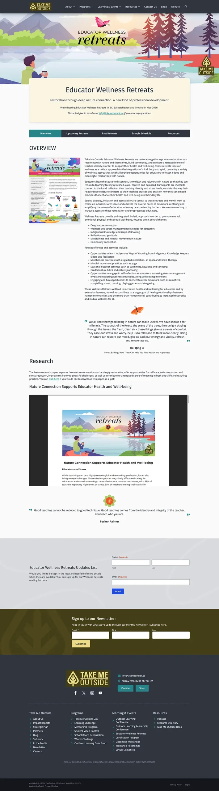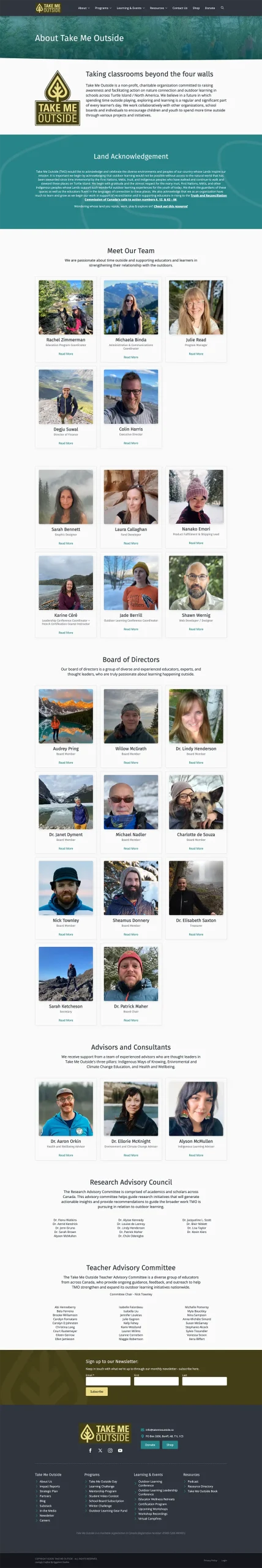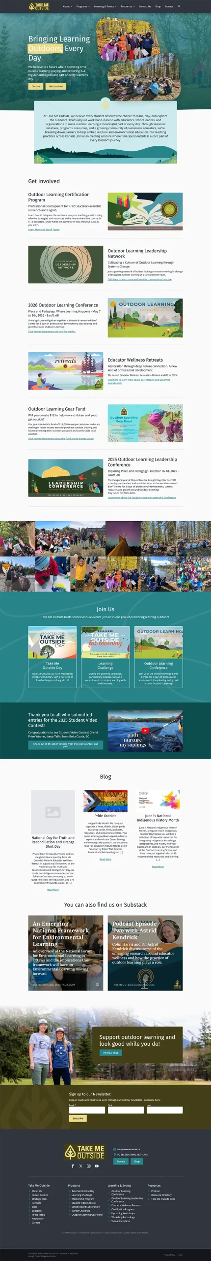 Take Me Outside has a plethora of offerings - from yearly recurring events, to certifications, to outdoor learning resources. All of these need to be beautifully integrated, easy to access, and concise: large website like this tend to sprawl and make navigation challenging.